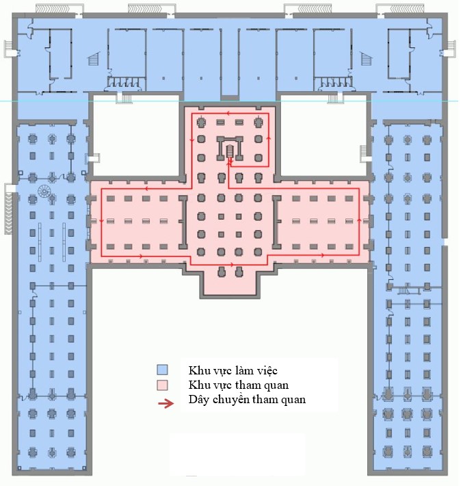 Để phát huy giá trị của Di sản kiến trúc – một mặt tất yếu của bảo tồn, Tòa án cần mở cửa cho công chúng có cơ hội chiêm ngưỡng kiến trúc và chứng kiến các hoạt động bảo tồn di tích, từ đó nâng cao nhận thức về di sản. [3] Hoạt động tham quan tòa án được tổ chức tách biệt với dây chuyền công năng xét xử và làm việc của tòa án. Nhằm đảm bảo tính nghiêm túc cho chức năng xử án, khu vực tham quan giới hạn trong những không gian công cộng của tòa nhà gồm: Sảnh tầng trệt, sảnh tầng lầu và phần trung tâm của tầng hầm.