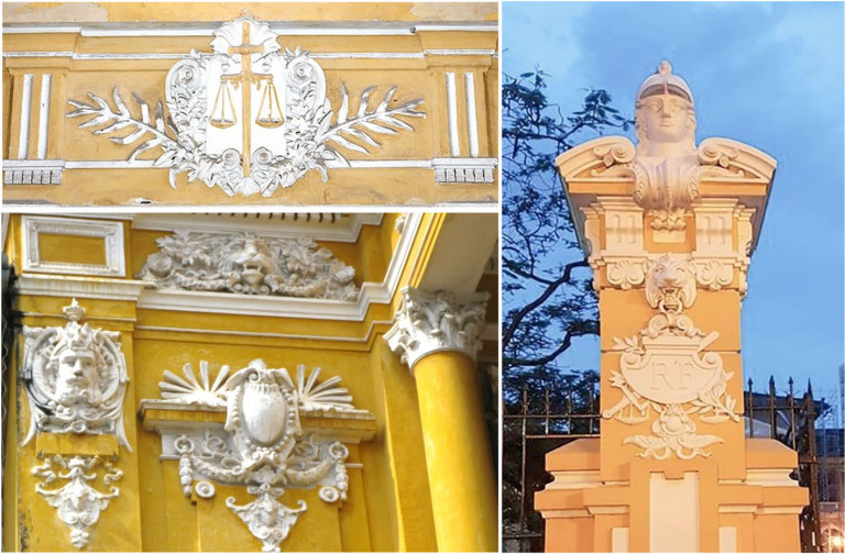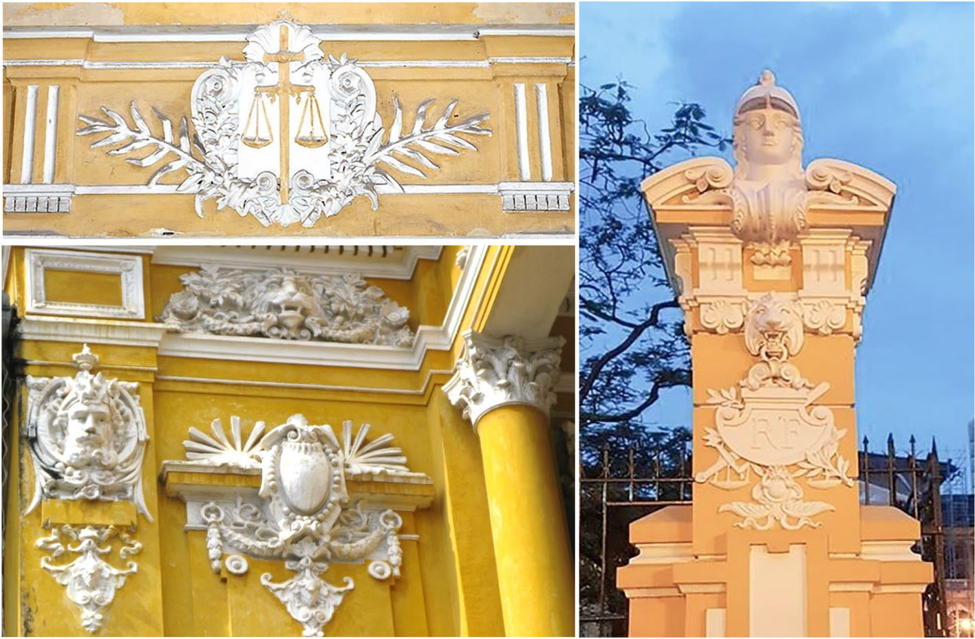 Nghệ thuật điêu khắc cho thấy sự pha trộn phong cách Barocco, Roccoco và hình tượng văn hóa bản địa. Các hoa văn trang trí phong phú, cầu kỳ, thể hiện nội dung pháp luật: Đầu sư tử, cán cân công lý, sách luật… với độ tinh xảo cao. Hình ảnh của người bản địa, với trang phục truyền thống, các chi tiết trang trí tượng trưng cho các nước Đông Dương: Tàu lá chuối và bụi môn (Việt Nam), cành cọ (Campuchia) được kết hợp hài hòa theo tinh thần chiết trung. [1]