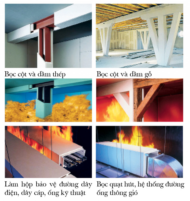 Tấm thạch cao Knauf FireBoard được sử dụng làm vách ngăn chống cháy, trần chống cháy, phòng trong phòng. Đặc biệt, sản phẩm này thường được dùng để bọc các cột, dầm làm bằng thép hoặc gỗ và làm hộp chống cháy chứa các đường dây điện, dây cáp, ống kỹ thuật. Knauf FireBoard có thể sử dụng khung thép hoặc không cần sử dụng khung thép trong các mục đích bọc phủ do sản phẩm được thiết kế có thể bắn vít hoặc kẹp ghim trực tiếp vào cạnh tấm. Khả năng chống cháy của Knauf FireBoard có thể thay đổi tùy thuộc vào chiều dày tấm và số lớp tấm được sử dụng.