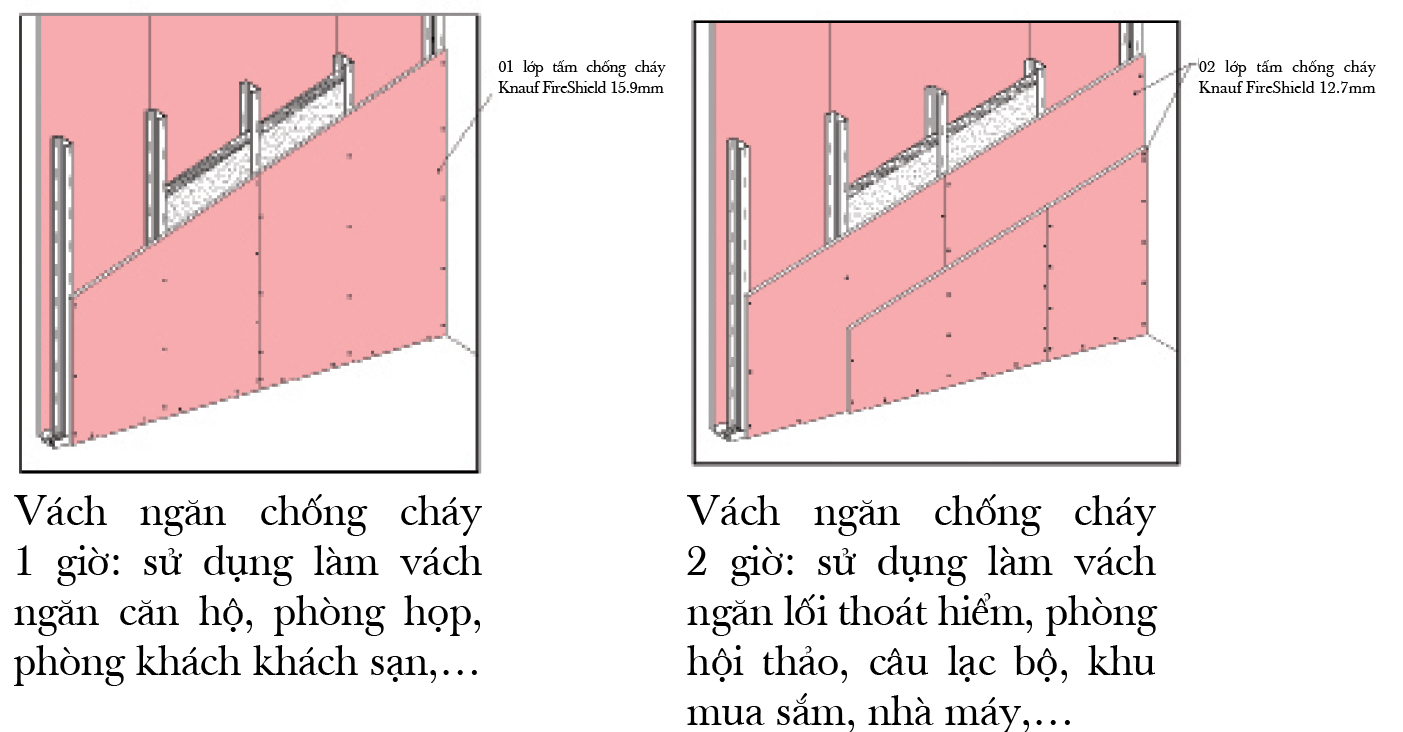 Tấm thạch cao chống cháy Knauf FireShield thường được sử dụng làm vách ngăn chống cháy, trần chống cháy. Sản phẩm này cũng được dùng để bọc các cột, dầm thép hoặc các thiết bị có yêu cầu chống cháy cao. Khả năng chống cháy của hệ kết cấu sử dụng tấm thạch cao FireShield có thể thay đổi phụ thuộc vào chiều dày tấm và số lớp tấm được sử dụng.