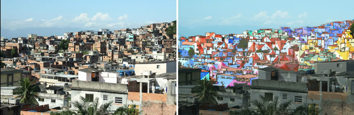 Rời châu Âu đến Nam Mỹ, một câu chuyện khác cũng cho thấy sức mạnh chuyển hóa không gian nhờ nghệ thuật: Dự án Favela Painting tại Rio de Janeiro. Nơi đây, những khu ổ chuột phủ màu xám của nghèo khó, bạo lực và kỳ thị đã trở thành phông nền cho một dự án nghệ thuật cộng đồng đầy táo bạo (Jordana, 2010).