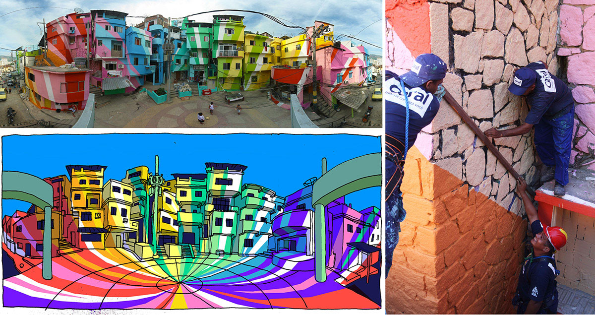 Bắt đầu từ năm 2005 bởi hai nghệ sĩ Hà Lan: Jeroen Koolhaas và Dre Urhahn – Favela Painting là hành trình “nhuộm màu” những khu dân cư nghèo như Vila Cruzeiro (Reis, 2020) và Santa Marta bằng các bức tranh tường khổng lồ, rực rỡ và đầy sinh khí. Khác với sự can thiệp từ bên ngoài, các tác phẩm ở đây được thực hiện bởi chính cư dân, từ trẻ em đến thanh niên, trong quá trình đào tạo, hướng dẫn và đồng sáng tạo (Jong, 2022). Một trong những điểm nhấn là Dự án Praça Cantão (2010), nơi 34 ngôi nhà được sơn phủ bằng các dải màu kéo dài trên 7.000m2, biến triền đồi từng u ám thành một dải sắc màu sống động có thể nhìn thấy từ xa (Marc, 2010).