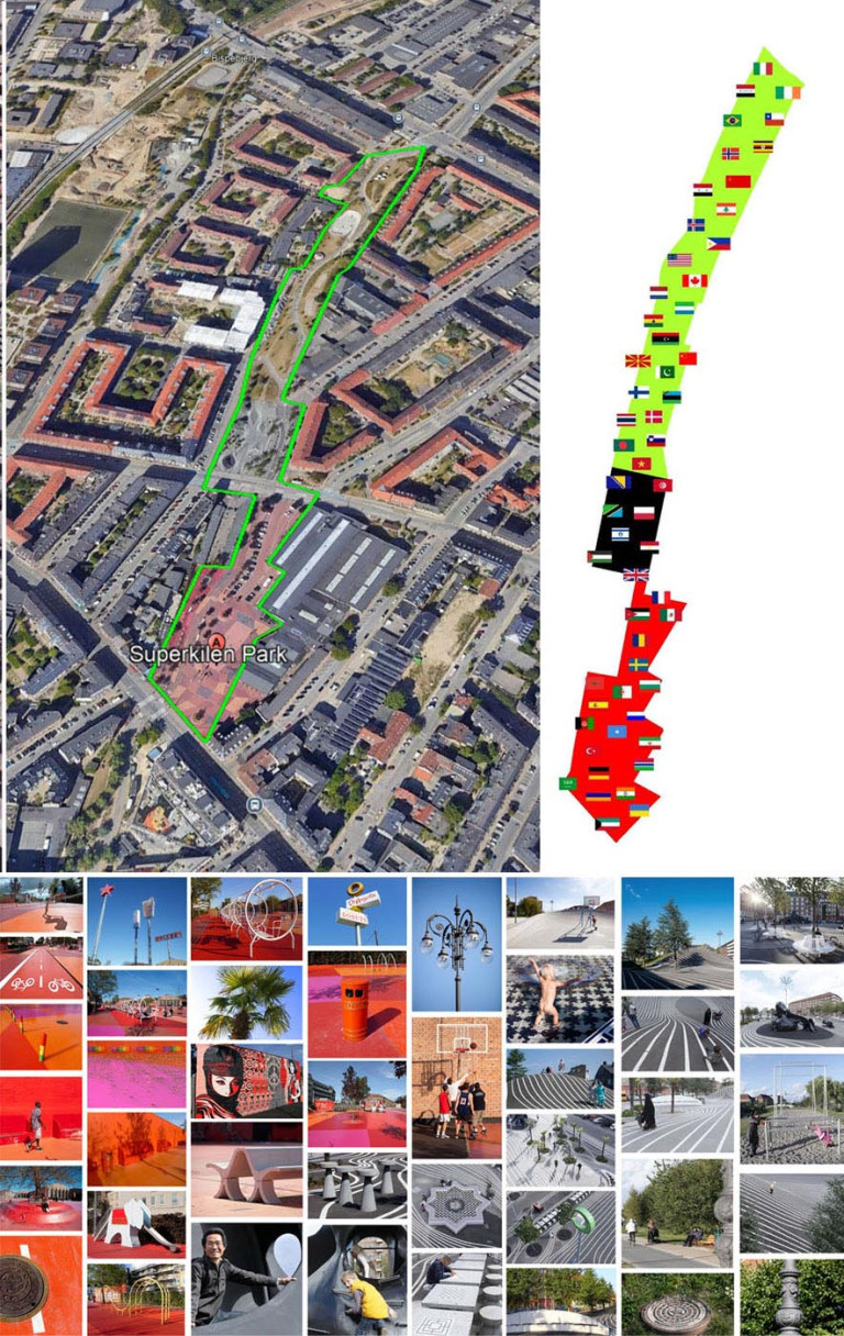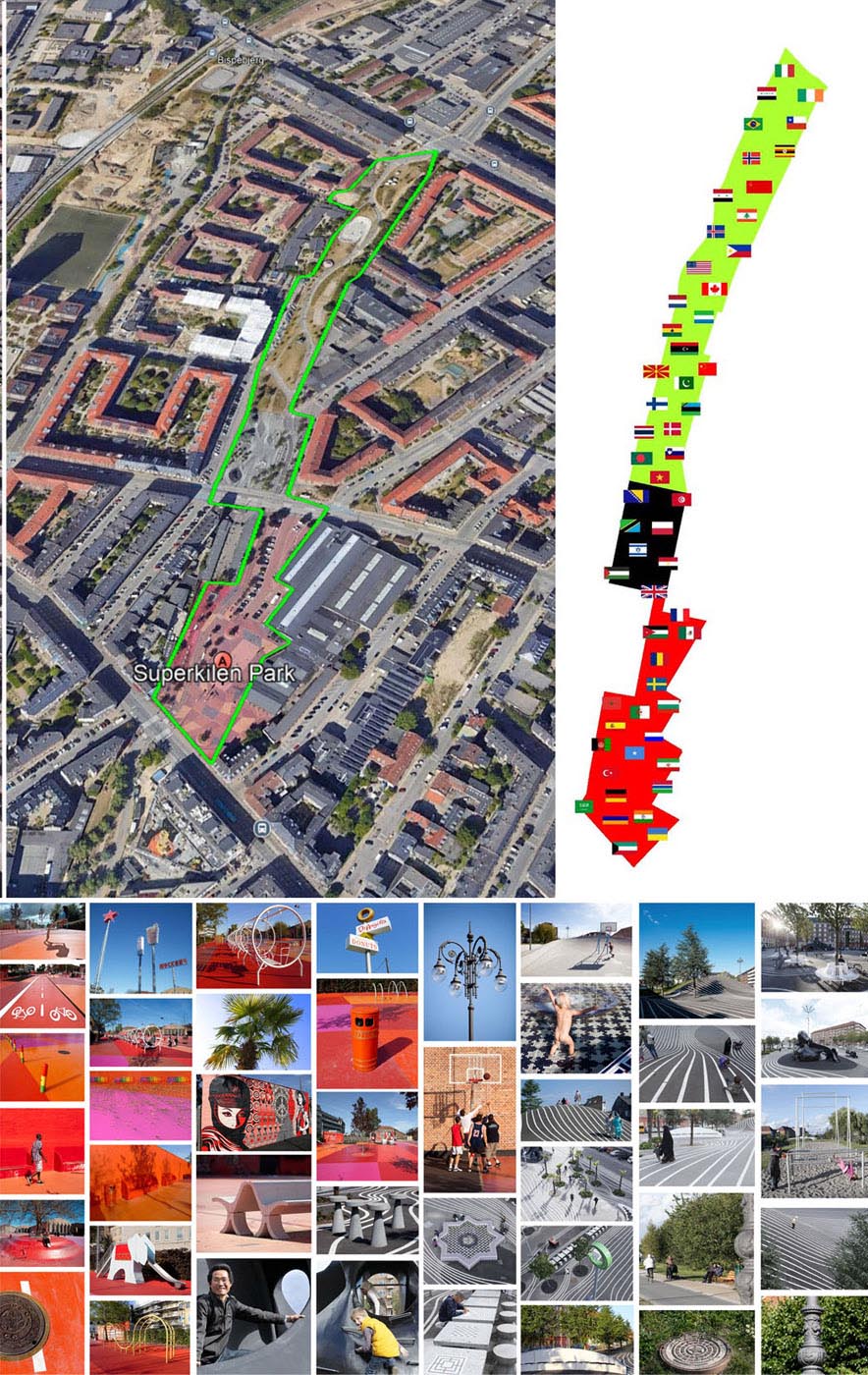 Dự án Công viên Superkilen, với sự kết hợp của công ty BIG (Bjarke Ingels Group), nghệ sĩ Superflex và nhóm thiết kế cảnh quan Topotek1, đã hồi sinh khu vực này thành một công viên công cộng quy mô lớn. Không gian được chia thành ba phần với ba màu sắc chủ đạo – Đỏ, Đen và Xanh – Mỗi khu vực lại đại diện cho một loại hình sinh hoạt: Từ thể thao, tụ họp đến thư giãn. Nhưng điều đặc biệt nhất nằm ở sự hiện diện của hơn 100 vật thể công cộng đến từ khắp nơi trên thế giới – Từ tượng Phật Thái Lan, đèn đường Ma-rốc, biển hiệu Trung Quốc, đến băng ghế Argentina. Những vật thể này không do nhà thiết kế đơn thuần chọn lựa mà đến từ chính đề xuất của cư dân địa phương (Superflex, 2012).