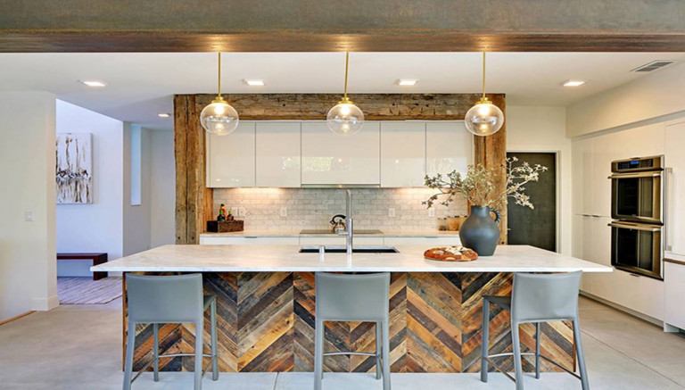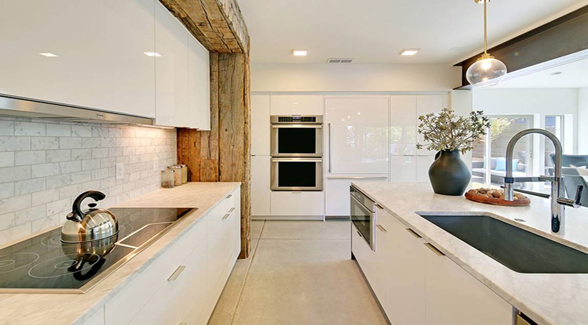 Một trong những chi tiết tạo nên cảm giác hiện đại, mà đương thời chính là việc sử dụng vật liệu gỗ trong không gian nhà bếp. Tủ bếp, kệ bếp và mặt bàn màu trắng là một sự tương phản độc đáo cho ngôi nhà.