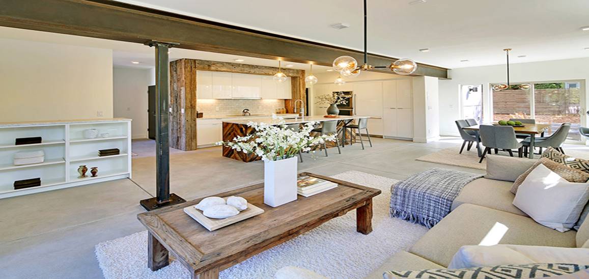 Hầu hết các phòng trong căn nhà đều được bố trí trong không gian mở giống như phòng khách. Từ vị trí này, ta có thể bao quát ra phòng bếp, bàn ăn và cả lối nhỏ dẫn tới phòng ngủ và khu vệ sinh.