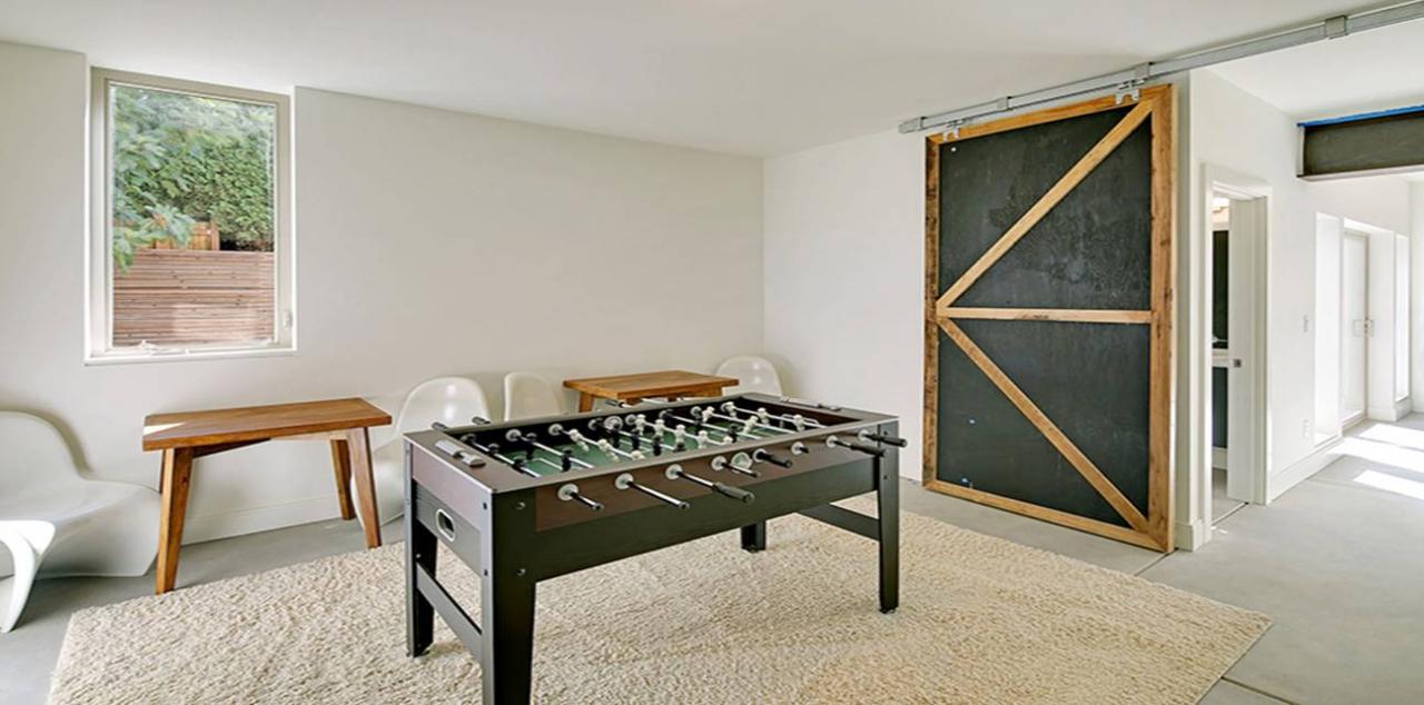 Đây là một không gian giải trí nhỏ của ngôi nhà. Điều tạo nên sự thú vị đó là việc sử dụng chiếc cửa kéo cỡ lớn. Màu sắc và vật liệu ở đây cũng được sử dụng tương tự như các phần khác của ngôi nhà.