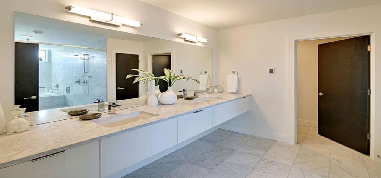 Phòng tắm rộng rãi với đầy đủ trang thiết bị cần thiết, tạo cảm giác thoải mái cho người sử dụng. Chiếc gương soi cỡ lớn giúp cho không gian thêm thoáng đãng hơn. Việc sử dụng cây xanh ở đây cũng là một điểm nhấn thú vị.