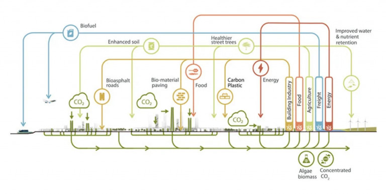 Theo Skidmore, Owings & Merrill ở Chicago, lượng carbon thu được trên mỗi kilomet vuông sẽ lên tới 120 tấn nếu biến đổi cảnh quan đô thị thành những khu vườn, tái xây dựng thành phố dưới dạng công trình hấp thụ carbon và đường phố trang bị thêm công nghệ hút carbon. Con số này có thể tăng gấp gần 3 lần nếu ứng dụng ở các công viên và nhiều không gian xanh khác.