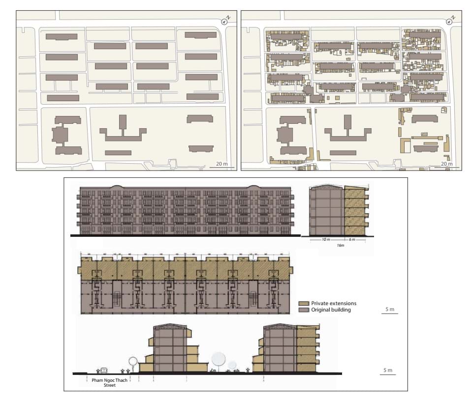 Việc bắt gặp những căn hộ tập thể có diện tích cơi nới từ 70 – 120 m2, nhưng diện tích thực tế trên sổ là chỉ khoảng 15 – 30 m2 là không hề hiếm. Thậm chí, hiện đang có một trào lưu kinh doanh bất động sản là mua lại những căn hộ tập thể cũ, giá rẻ, chưa cải tạo để cơi nới, chỉnh trang và “mông má” lại bán với giá cao hơn. Những căn hộ tập thể Giảng Võ, Thành Công, Láng Hạ, nhờ vị trí thuận lợi… vẫn nhộn nhịp luân chuyển trên các sàn bất động sản với giá thành ngày một phi mã. Các không gian tầng trệt được cải tạo và mở rộng các loại hình dịch vụ thành các cửa hàng, quán ăn, tiệm café. Tính thích đáng của quá trình “chắp vá” được thể hiện rõ, thực chất là giải quyết nhu cầu cấp bách từ quá trình đô thị hóa đang diễn ra và tổ chức lại không gian (Shim, 2005).