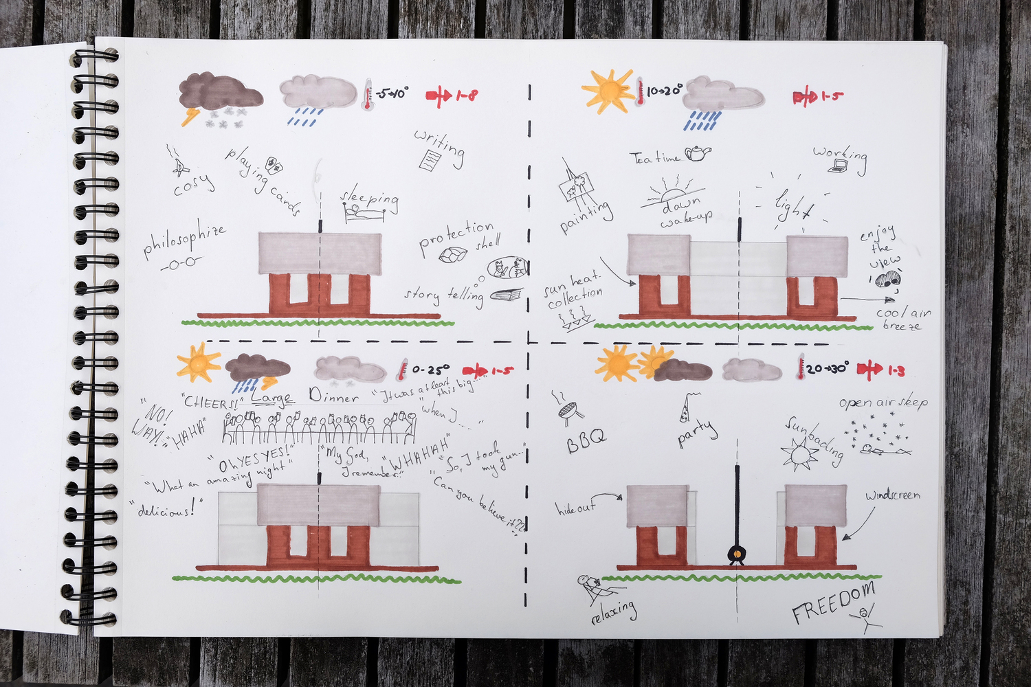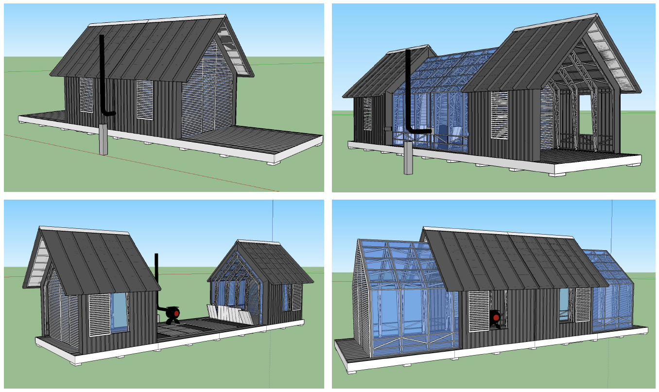 Trong điều kiện thời tiết lạnh, những bước tường sẽ trượt vào tạo một không gian kín, ấm cúng. Nhưng khi thời tiết ấm lên, lớp tường bên ngoài sẽ trượt ra để đem lại nhiều ánh sáng hơn cho ngôi nhà. Khung kính bên trong có tác dụng chắn mưa, gió.