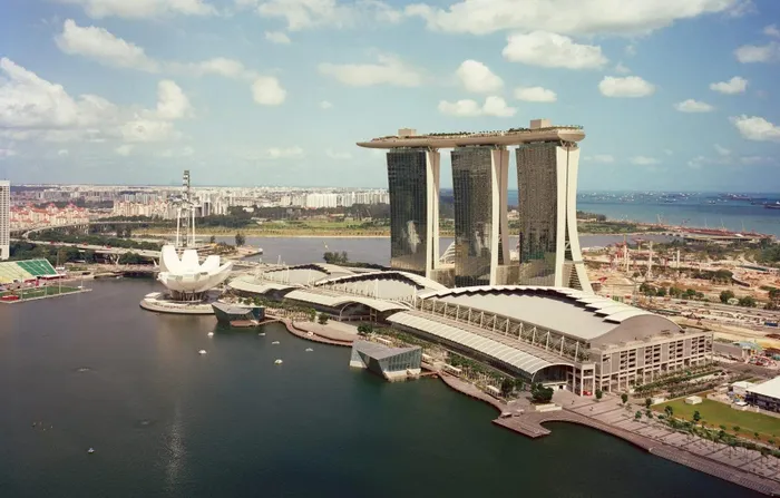Marina Bay Sands, Singapore do kiến trúc sư Moshe Safdi thiết kế. Safdi còn được mệnh danh là ông vua của sky bridge (cầu trên không). Marina Bay Sands gồm ba tòa tháp cao 57 tầng, với một khu vườn kết hợp cầu đi bộ trên không. Đây được coi là biểu tượng kiến trúc, đại diện cho một loại hình công cộng mới tại Singapore. Ảnh: Timothy Hursley.