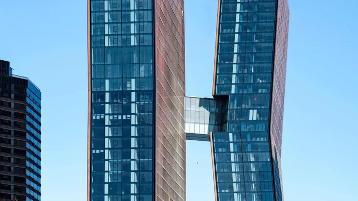 Một trong hai tòa tháp của American Copper Buildings, Mỹ có thiết kế uốn cong đặc biệt. Các tầng từ tầng 27 đến tầng 29 được nối với nhau bằng một sky bridge dài 30 m. Cây cầu có bể bơi, bể sục, quầy bar, sảnh tiếp tân của khu chung cư cao cấp. Ảnh: SHoP Architects.
