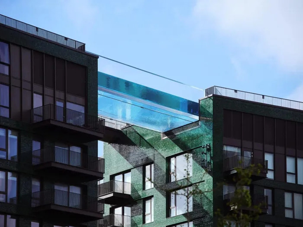 Sky Pool, London, Anh đã gây tranh cãi giới kiến trúc vì thiết kế đặc biệt. Cây cầu là một chiếc bể bơi trong suốt nằm lơ lửng trên không và nối liền hai tòa nhà. Công ty thiết kế cho biết: “Chính sự trong suốt, cảm giác nhẹ nhàng khi chạm vào khiến nó trở nên độc đáo và gợi mở trí tưởng tượng”. Ảnh: Simon Kennedy.