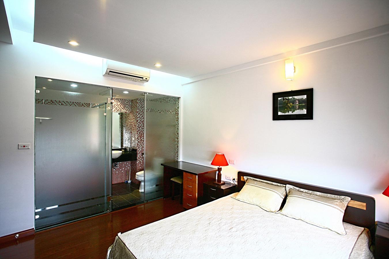 Việc “mở” một phòng tắm trong phòng ngủ khá phổ biến trong những ngôi nhà được thiết kế xây dựng theo quan điểm hiện đại, kiến trúc hiện đại. Tuy nhiên, việc “mở” đó cũng là giải pháp kiến trúc – nội thất trong nhiều trường hợp. Đó là khi phòng tắm kế liền phòng ngủ nhưng không có hướng thoáng – sáng, nên việc sử dụng vách kính là một giải pháp chiếu sáng xuyên phòng. Hoặc trong một không gian không lớn của phòng ngủ, thì việc “mở” phòng tắm là một thủ pháp vay mượn để mở rộng tầm nhìn, mở rộng không gian cho cả hai.