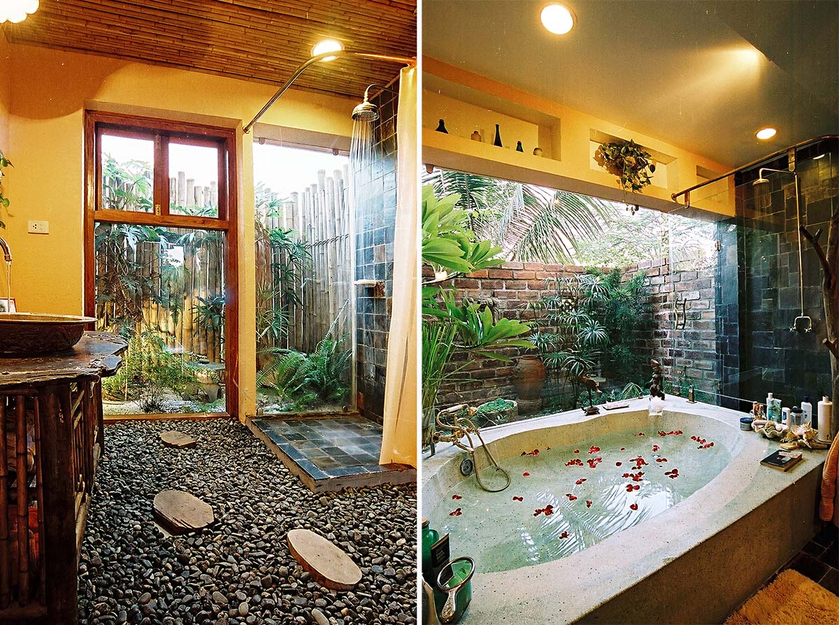 Bên cạnh những phòng tắm mở vào trong là những phòng tắm mở ra ngoài. Đó là những phòng tắm có khoảng trống, tầm nhìn hướng ngoại; mà thay vì được che kín theo kiểu truyền thống lại được mở rộng (bằng cửa sổ lớn, vách kính, hoặc… bỏ trống) để tận hưởng không gian, tận hưởng thiên nhiên bên ngoài bằng cả thị giác và cảm giác. Những phòng tắm kiểu này thường đòi hỏi một khoảng cách “an toàn” nhất định của khoảng mở. Ví dụ như phòng tắm trên tầng cao, không có kiến trúc nào ở cự ly gần chiếu vào; nếu ở tầng trệt thì phải có một khoảng đất, một khoảng vườn của mình để có thể kiểm soát, tránh những lối giao thông qua lại. Ở trong phòng tắm nhìn ra một không gian rộng lớn, nhìn ra một góc tiểu cảnh đẹp, hay gần gũi cây cối thiên nhiên cũng là một cái thú, sự thư giãn tích cực và hiệu quả cho tinh thần. Trong nhiều trường hợp bị hạn chế về không gian, hay mặt thoáng, thì việc xử lý một phòng tắm mở ra… giếng trời cũng là một giải pháp mang lại hiệu quả nhất định – tất nhiên hướng mở ra giếng trời phải kín đáo, tránh bị “chiếu” từ các vị trí khác trong nhà.