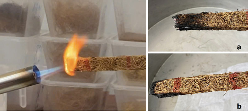 Kết luận: Vật liệu xơ dừa có bổ sung 10% chất chống cháy đạt cấp HB theo tiêu chuẩn UL94 trong phép thử cháy ngang. Tuy nhiên, do điều kiện thí nghiệm hạn chế và nghiên cứu chỉ được mô phỏng theo tiêu chuẩn, kết quả cần được kiểm chứng thêm bằng các thử nghiệm chuẩn hóa.
