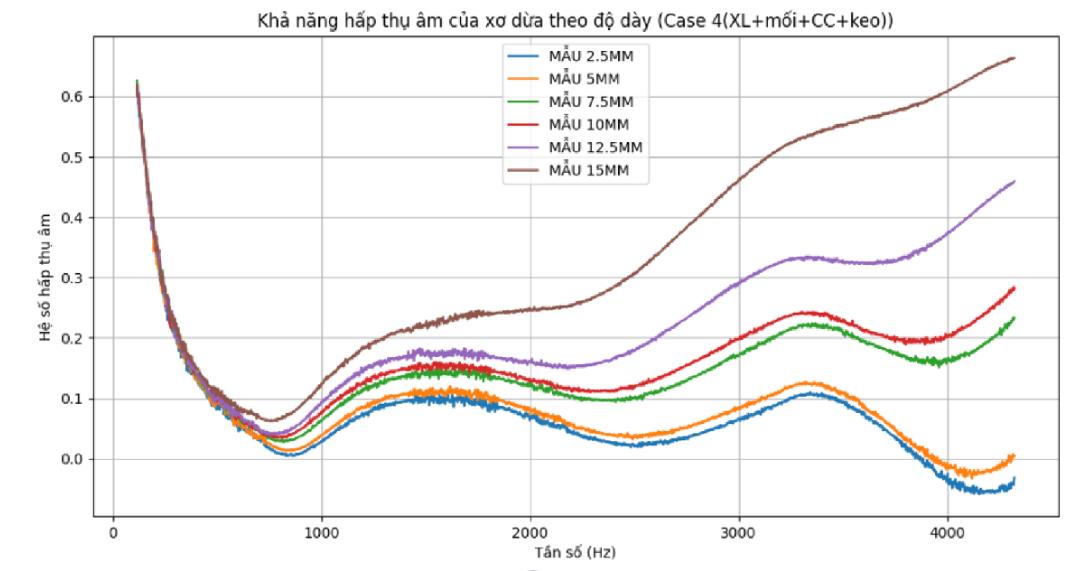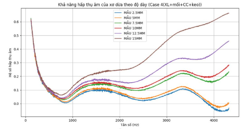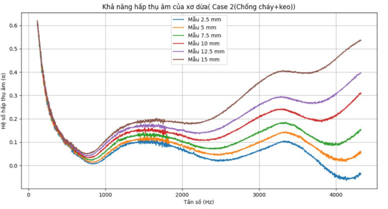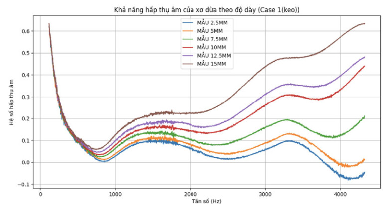 Kết quả thí nghiệm từ ống trở kháng bao gồm các thông số về hệ số hấp thụ âm của vật liệu được xuất ra dưới dạng tệp số liệu thô để xử lý. Các dữ liệu này đã được xử lý và phân tích bằng ngôn ngữ lập trình Python thông qua nền tảng điện toán đám mây miễn phí Google Colaboratory (Colab). Trong nghiên cứu này, dữ liệu so sánh khả năng hấp thụ âm của 4 mẫu xơ dừa với độ dày khác nhau được xử lý và biểu diễn dưới dạng biểu đồ sau: