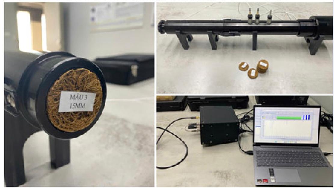 Thí nghiệm được thực hiện bằng ống đo trở kháng theo tiêu chuẩn ISO 10534-2 và ASTM E1050. Thiết bị sử dụng là ống trở kháng Mecanum với đường kính trong 44.44 mm, kích thước tổng thể 80 × 20 × 20 cm, và dải tần số từ 45Hz đến 4300 Hz. Phương pháp đo dựa trên kỹ thuật hàm truyền, cho phép phân tách năng lượng của sóng tới và sóng phản xạ. Hai micro được bố trí dọc theo thân ống để ghi nhận sự chênh lệch áp suất âm, từ đó dữ liệu được xử lý nhằm xác định hệ số hấp thụ âm (hút âm) của vật liệu. Cấu tạo và nguyên lý hoạt động của ống trở kháng được minh họa ở hình bên dưới. Hệ số hấp thụ âm thanh (α) của vật liệu nằm trong khoảng từ 0 đến 1 [14].