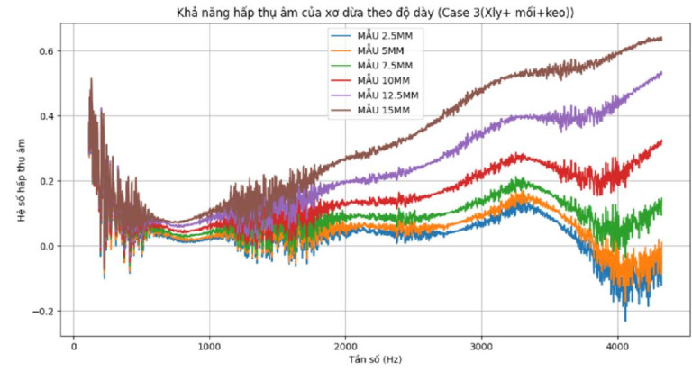 - Mẫu 15 mm: α đạt cao nhất (0,6-0,7), cho khả năng tiêu âm mạnh ở phổ rộng, đặc biệt hiệu quả ở tần số cao.