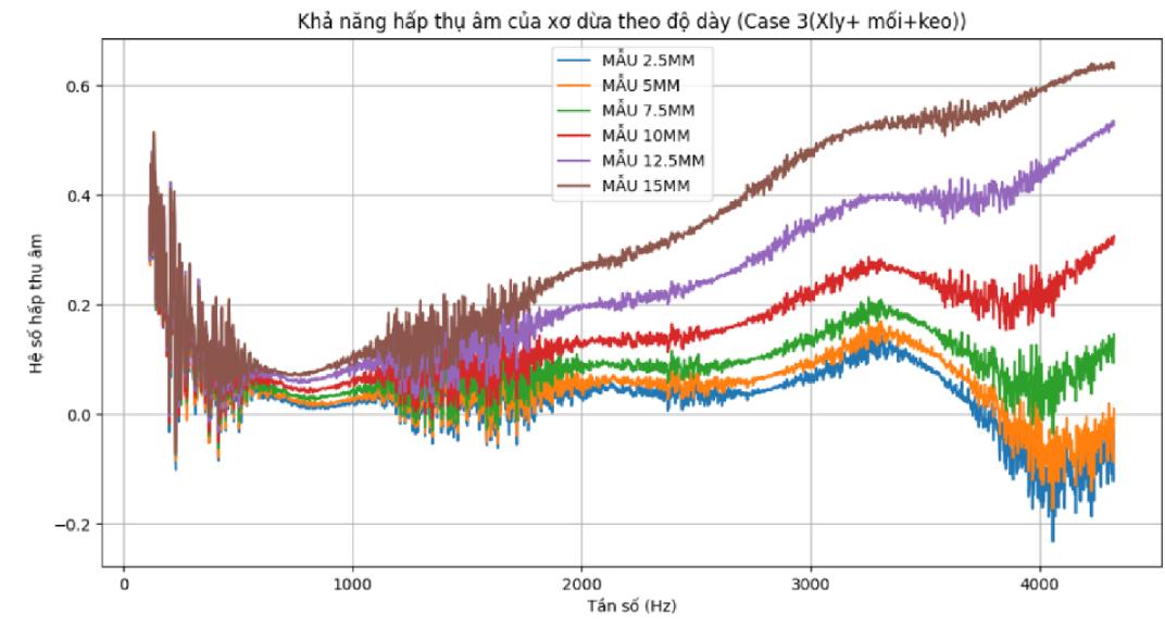 Các mẫu được khảo sát tại ba độ dày tiêu chuẩn 10mm, 12,5mm và 15mm. Các biểu đồ minh họa ở các hình bên dưới (Hình 12,13, 15) trình bày sự biến thiên hệ số hấp thụ âm theo dải tần của từng mẫu, qua đó làm rõ ảnh hưởng của các phụ gia khi phối trộn vào xơ dừa đối với hiệu suất tiêu âm của vật liệu.