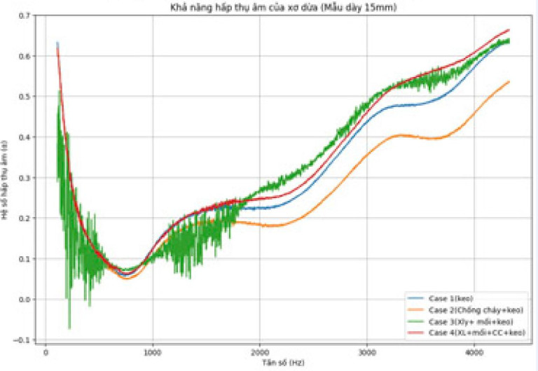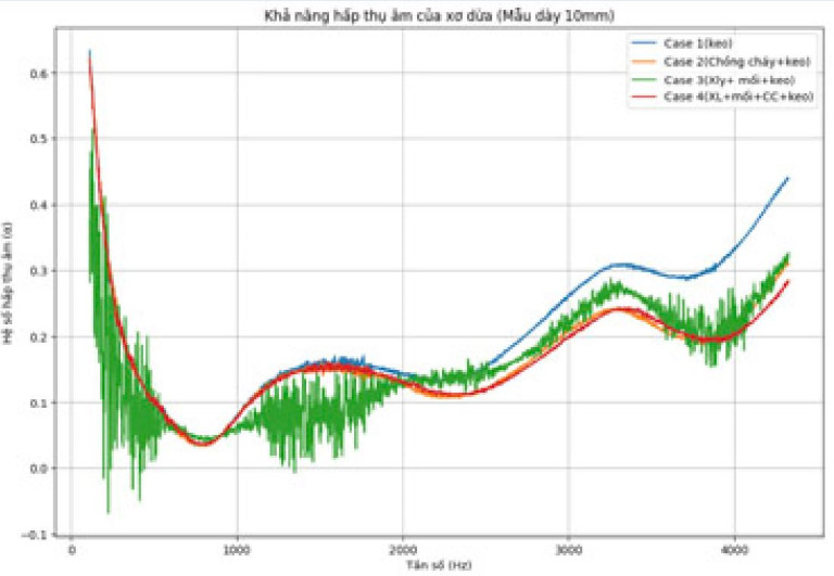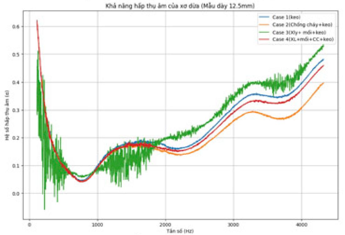 Khảo sát cho thấy khả năng hấp thụ âm của xơ dừa phụ thuộc rõ rệt vào phương pháp xử lý. Case 1 (xơ dừa thô + keo) có hiệu quả thấp, α tối đa khoảng 0,6. Case 2 (thêm chất chống cháy) cải thiện độ ổn định, đặc biệt ở vùng trung tần. Case 3 (xử lý NaOH + chống mối mọt) cho α cao hơn ở tần số cao nhưng dao động mạnh ở tần số thấp. Case 4 (kết hợp NaOH, chống mối mọt, chống cháy) đạt α > 0,65 và ổn định nhất. Kết luận: Xử lý hóa học NaOH và phụ gia chống cháy giúp nâng cao và ổn định hiệu suất tiêu âm của vật liệu xơ dừa.