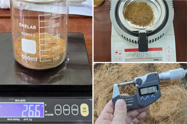 Xơ dừa thô sau khi mua về, được xử lý sơ bộ nhằm loại bỏ vỏ, mùn và sợi không đồng nhất. Chiều dài sợi dao động từ 30mm đến 260mm. Đường kính sợi giao động từ 0.095mm đến 0.463mm. Xơ dừa được cắt nhỏ và đo độ ẩm bằng máy OHAUS. Chia thành ba lần đo, với 2g cho mỗi lần đo, nhiệt độ 130oC (khuyến cáo từ 120-150oC) ở chế độ tự động, nhằm đưa độ ẩm về mức 10-12%.