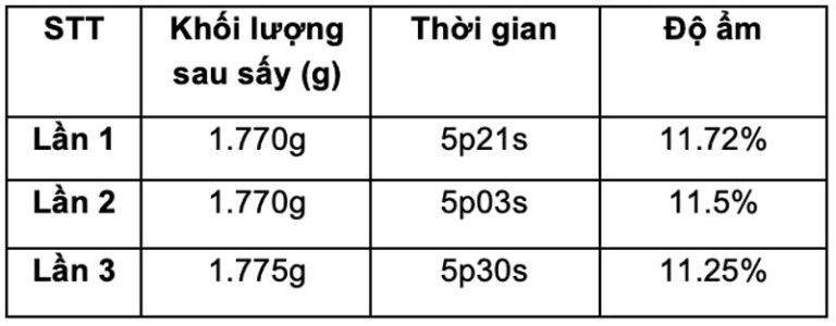 Dựa trên dữ liệu từ ba lần đo ta có thể kết luận được thời gian sấy dao động từ 5 phút đến 5 phút 30 giây cho mẫu 2g xơ dừa. Độ ẩm trung bình 11.49%, kết quả nằm trong khoảng khuyến cáo.