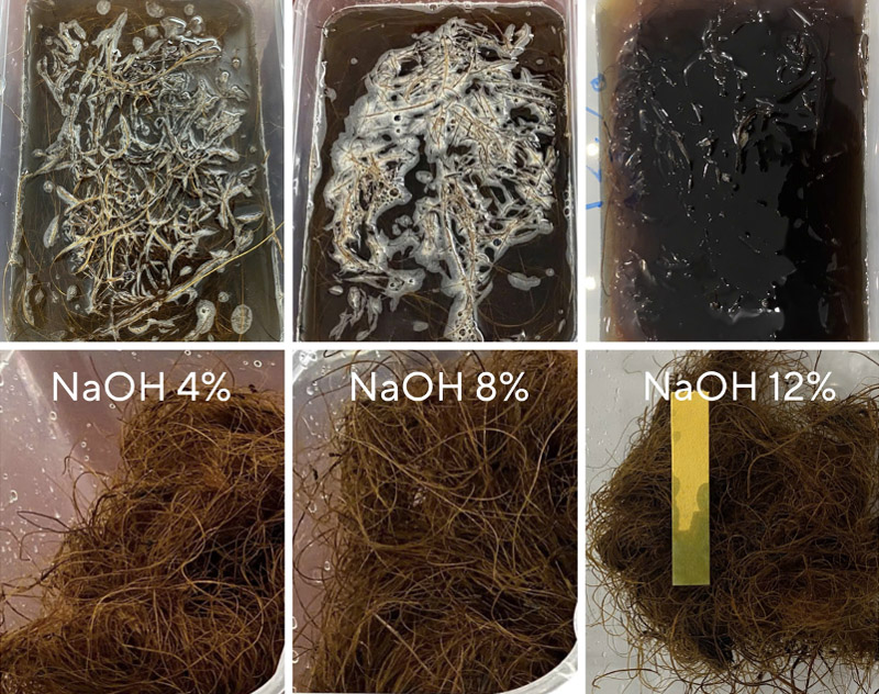 Kết quả: Mẫu 4% ngâm trong 5 giờ đã đạt được màu vàng xanh sáng. Ngược lại, mẫu 8% có màu sậm hơn nên cần thời gian dài hơn, cần 10 giờ để đạt được màu vàng sáng. Điều này cho thấy việc nồng độ NaOH ban đầu ảnh hưởng tới thời gian tẩy. Đặc biệt, mẫu 8% sau tẩy có màu sáng hơn, mở ra tiềm năng trong ứng dụng vật liệu.