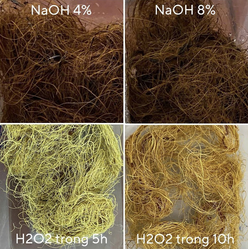 Nhằm cải thiện tính thẩm mỹ và tạo điều kiện thuận lợi cho quá trình nhuộm màu đa dạng trong các ứng dụng sau này, xơ dừa đã được xử lý bằng dung dịch hydrogen peroxide (H2O2) nồng độ 3%, với tỷ lệ sử dụng là 20 ml dung dịch cho mỗi gam xơ dừa. Quá trình tẩy trắng được thực hiện với thời gian khác nhau tùy theo mức độ xử lý kiềm trước đó: mẫu xơ dừa đã xử lý bằng dung dịch NaOH 4% được tẩy trong thời gian 5 giờ, trong khi mẫu xử lý bằng NaOH 8% được tẩy trong 10 giờ. Việc áp dụng quy trình này giúp loại bỏ sắc tố nâu đặc trưng của xơ dừa, đồng thời tạo nền màu sáng tự nhiên, phù hợp cho các bước xử lý màu tiếp theo trong chế tạo vật liệu tiêu âm và trang trí nội thất.