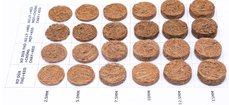 - Mẫu 3: Xơ dừa đã qua xử lý hóa học kết hợp với chất chống mối mọt và keo kết dính;