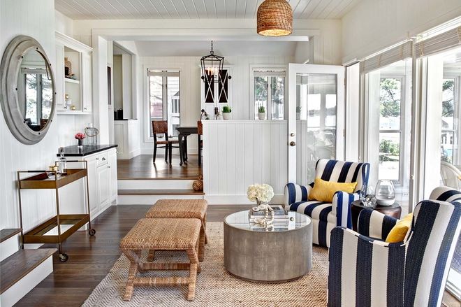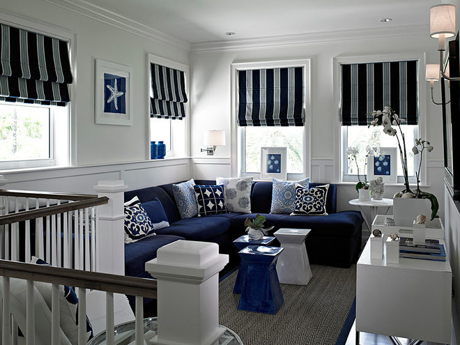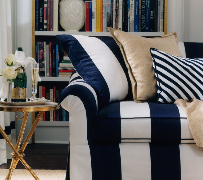 Một cân nhắc khi kết hợp: Trộn các mẫu họa tiết trong một giới hạn về màu sắc là cách để kết hợp chúng tuyệt vời không bị lộn xộn. Ví dụ, hoa tiết chủ đề hàng hải được sử dụng ở nhiều loại vải đồ nội thất khác nhau hình ảnh dưới đây, tất cả chúng có chung màu xanh và trắng để tạo sự hòa quyện và đồng nhất cho không gian.
