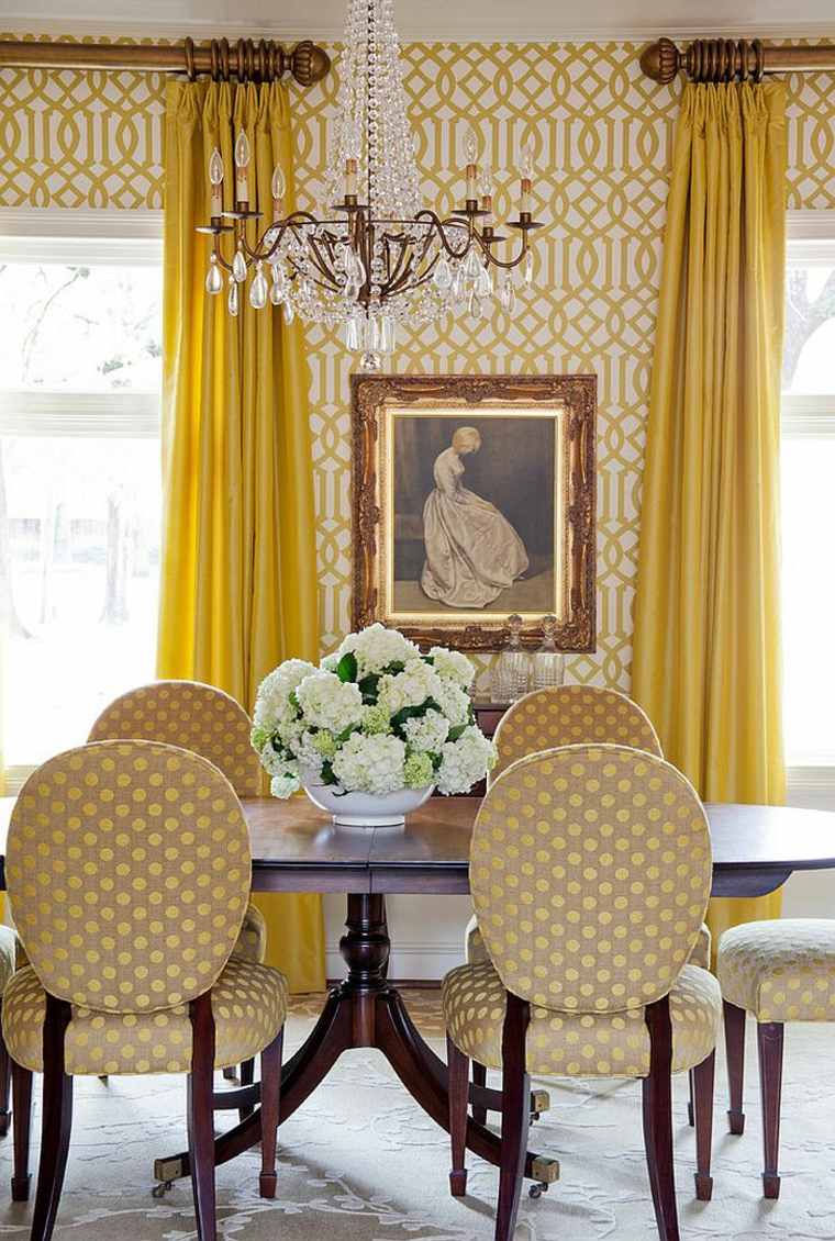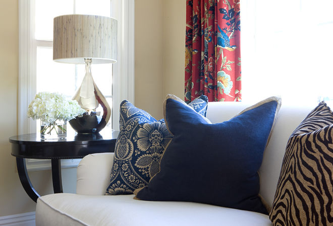 Sự cân bằng này thường có thể đạt được bằng cách lặp đi lặp lại một vài mẫu họa tiết ở những đồ đạc khác nhau, chẳng hạn như trong căn phòng này, có cùng một chất liệu trên tấm rèm và chiếc ghế, một họa tiết thứ hai được tìm thấy trên tấm thảm và cuối cùng là chiếc vỏ gối hoa văn tinh tế.