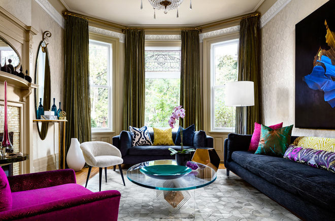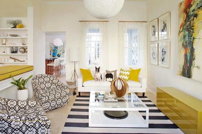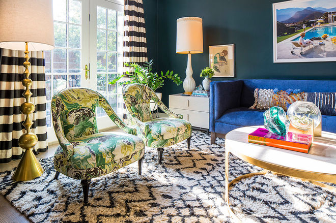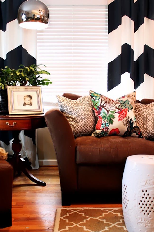 60-30-10: Đây là một tỷ lệ vàng tuyệt vời cho việc phối hợp hai hoặc nhiều họa tiết hoa văn khác nhau cân đối. Chọn một họa tiết hoa văn chính chiếm lĩnh trong không gian với tỷ lệ 60% tiếp xúc là chiếc thảm hình ziczac (hình ảnh dưới), sau đó chọn một mẫu hoa văn phụ phối hợp thứ 2 với tỷ lệ tiếp xúc 30% là chiếc rèm kẻ sọc, và cuối cùng hãy chỉ dành 10% cho một ý tưởng táo bạo có khả năng tương phản mạnh chẳng hạn như chiếc ghế bọc đệm này hoặc một vài họa tiết nhỏ trên gối.