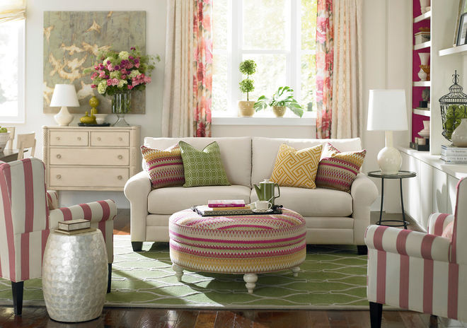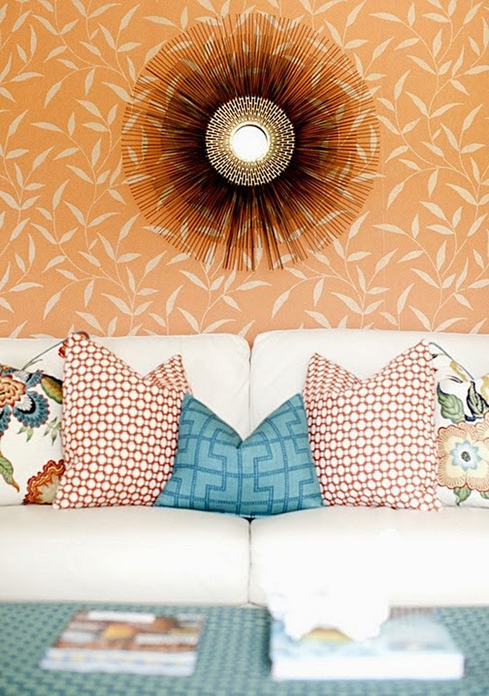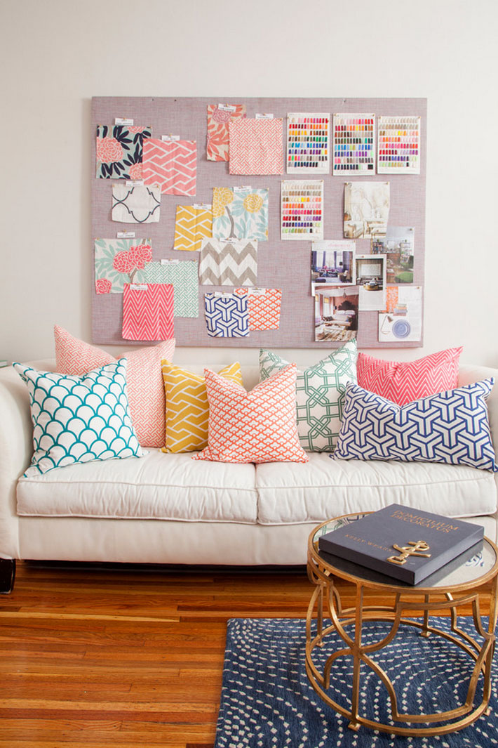 Thay vì chọn những cặp màu sử dụng đồng nhất cho mỗi mẫu, bạn có thể thử chọn một điểm nhấn trên sản phẩm vải nào đó mình ưa thích và tạo cảm hứng màu sắc cho toàn không gian. Ví dụ như ở đây, bạn có thể thấy rằng chỉ một chi tiết hoa văn vừa đủ trên gối sofa, và chiếc đôn cũng đủ tạo nên bộ sưu tập đa dạng nhưng vô cùng gắn kết với những sofa màu trơn trong không gian.