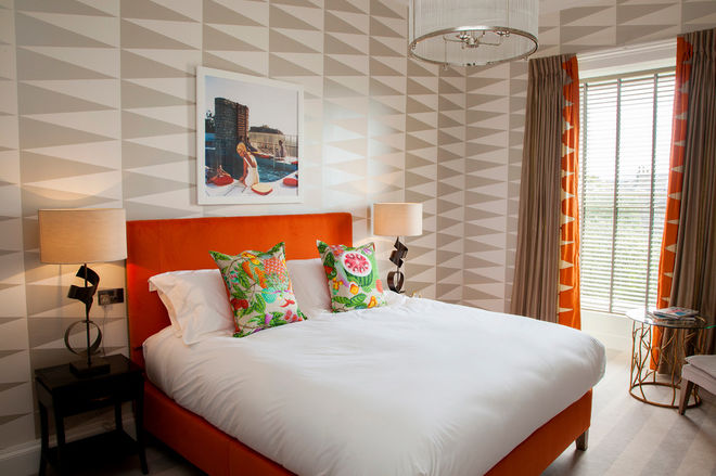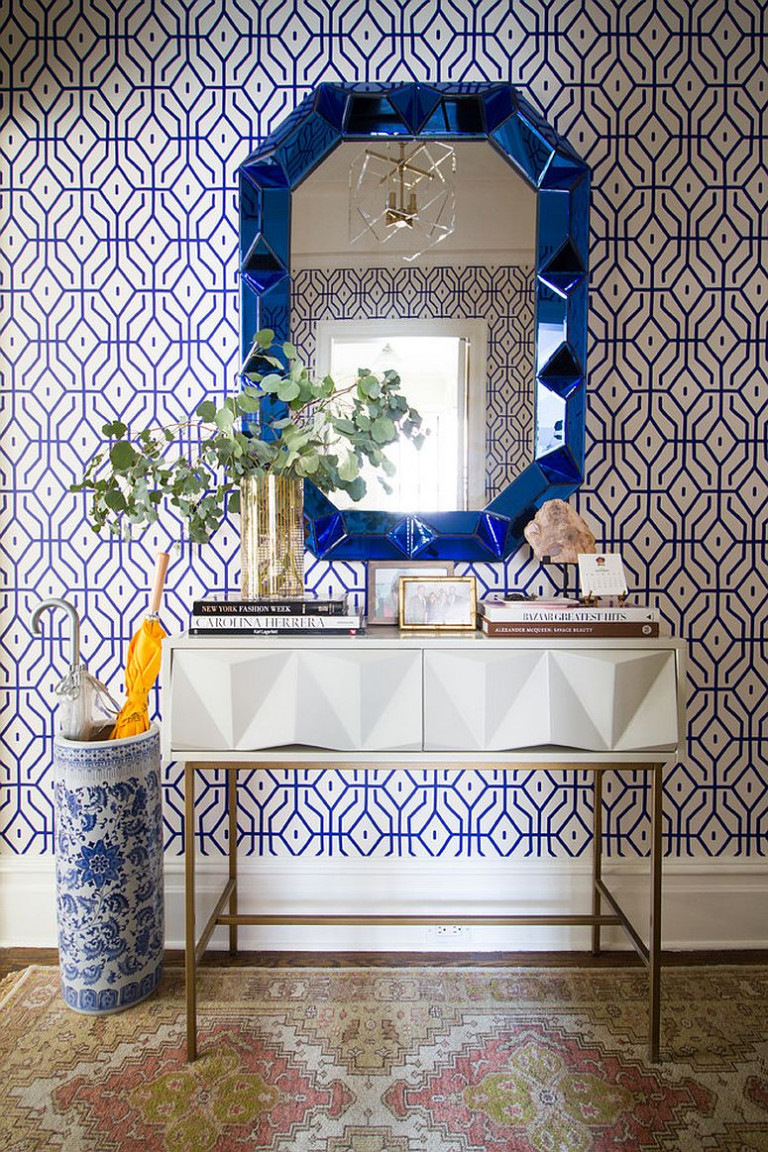 Trong căn phòng này, ta cảm thấy dường như phong phú hơn bởi vì nó bao gồm ba họa tiết đa dạng nhưng khi nhìn thoáng qua, chúng ta chỉ thấy những họa tiết hình học như là một chủ đề xuyên suốt. Chiếc bình hoa văn truyền thống và tấm thảm sàn có tỷ lệ hoa văn nhỏ hơn được kết hợp hoàn hảo với mảng giấy dán tường họa tiết hình học nhưng vẫn có điểm nhấn giá trị riêng mình.
