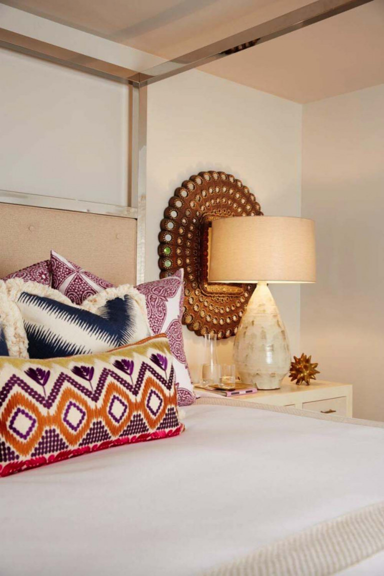 Đôi khi, chỉ một điểm nhấn trên màu nền (thường là những màu trung tính) cũng có thể giúp bạn kết hợp các mẫu hoa văn với nhau. Những cái gối họa tiết khác nhau, không cùng màu sắc, nhưng tất cả chúng đều được tôn lên trên nền giường trắng mềm mại, sự kết hợp giống như một bộ.