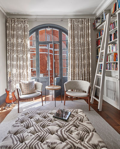 Pha trộn các họa tiết hoa văn với tỷ lệ hài hòa có thể là là một việc khá phức tạp, mặc dù bạn nắm được các nguyên tắc kết hợp chúng. Căn phòng này trang trí theo phong cách cổ điển, với tỷ lệ hoa văn lớn trên rèm ghế và một vài hoa văn tỷ lệ nhỏ hơn trên ghế đôn. 2 chiếc ghế hoa văn tỷ lệ lớn rõ ràng bị thu hút hơn, nó tương phản với tấm thảm thô dưới sàn. Một sự sắp đặt có ý đồ.