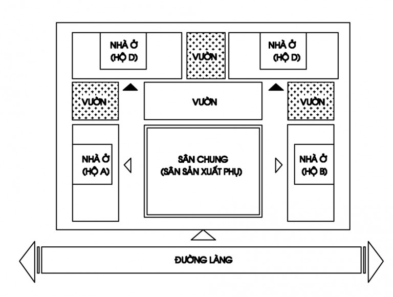 + Hướng thứ hai, không gian kiến trúc NONT đang biến đổi sang gia đình nhỏ với khuôn viên khu đất nhà ở ngày càng thu hẹp, diện tích tối đa tại các điểm dãn dân nông thôn chỉ còn 100m2/lô (chưa bằng 1/3 so với trước đây); diện tích chia lô để bán hoặc chia cho các con từ khu đất gia đình cũng chỉ bình quân từ 120-150m2/lô. Việc chia lô làm nhà ở tại nông thôn vùng ĐBBB đang là trào lưu và xuất hiện các dãy nhà “Phố làng” tại nông thôn. Hướng thứ hai này làm thay đổi cơ bản không gian truyền thống nên chúng ta tập trung phân tích để thấy rõ sự biến đổi của NONT.