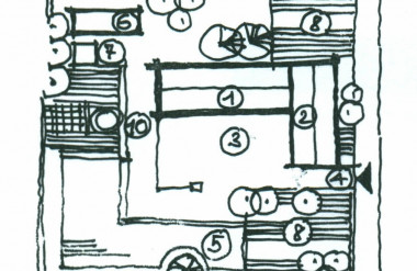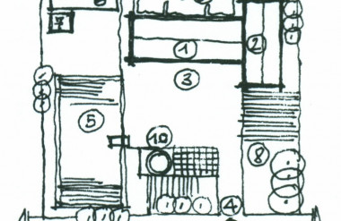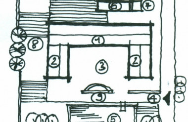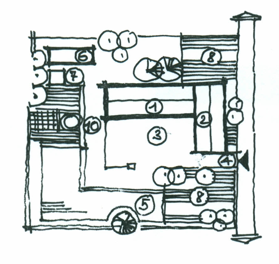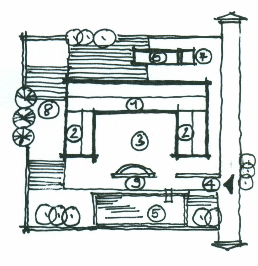 1. Nhà chính; 2. Nhà phụ; 3/ Sân phơi; 4. Cổng; 5. Ao cá; 6. Chuồng chăn nuôi; 7. Nhà vệ sinh; 8. Vườn; 9. Bể cảnh, non bộ, bình phong; 10. Giếng nước.
