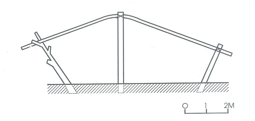 Từ thời kỳ đồ đá cũ (khoảng 2,5 vạn năm – 1 vạn năm tr.CN) kéo dài đến thời kỳ đồ đá mới (khoảng 1 vạn năm – 3.000 năm tr.CN) vùng phía Nam ĐBBB có nền văn hóa Tràng An là một trong những nền văn hóa lâu đời nhất tại Việt Nam, lúc đầu cha ông chúng ta ở tản mạn trong các hang động đá vôi ven sông, suối, chưa biết tạo dựng không gian ở cho mình, sinh sống bằng hái lượm và săn bắt. Sau đó dần tập trung về trung du vùng ĐBBB và sinh sống quần cư thành các làng mạc. Đến trước thời kỳ đồ đồng (khoảng 3.000 năm tr.CN) nhà ở vùng ĐBBB đã có những bước tiến vượt bậc trong cấu trúc làng, xã cũng như tổ chức không gian nhà ở. Tuy nhiên, do ngôi nhà ở vùng ĐBBB ảnh hưởng bởi nền nông nghiệp lúa nước của người Lạc Việt nên nhà ở chủ yếu là nhà sàn. Căn cứ vào hình ảnh còn lưu lại trên mặt trống đồng thuộc văn hóa Đông Sơn, chúng ta thấy có 2 loại hình kiến trúc là nhà sàn mái cong hình thuyền và nhà sàn mái hình tròn [6]. Nhà sàn có mái cong hình thuyền, hai đầu mái có hoa văn trang trí, có hai cột chống, ở giữa có bố trí thang để lên sàn (giống nhà sàn hiện nay). Nhà mái hình tròn bố trí một cửa ở giữa, hai bên có phên chắn trang trí, hai nóc mái cong trang trí hai hình tròn khác nhau, có hai cột chống ở hai đầu ngôi nhà. Nhà mái tròn có thể sử dụng cho sinh hoạt tín ngưỡng, cộng đồng (Hình 1). Như vậy, một thời gian dài nhà ở dân gian người Việt chủ yếu là loại nhà sàn tựa trên cột, đây là loại nhà phù hợp với môi trường tự nhiên vùng châu thổ.