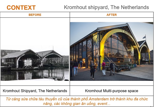 Trường hợp tại Amsterdam: Cách ứng xử theo lối đề cao di sản, thổi hồn cho nó để một công trình không mấy giá trị về kiến trúc cũng được sống dậy trong các hoạt động đương đại, giải pháp này đã tạo điều kiện cho khu vực lận cận cũng trở nên có giá trị hơn.