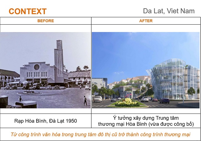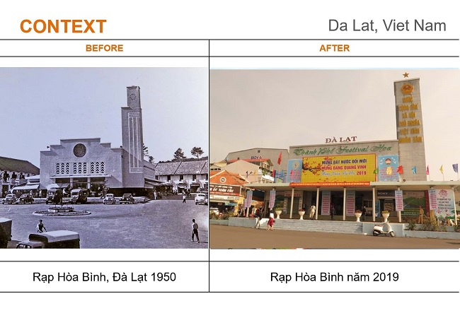 Trường hợp tại Đà Lạt: Ứng xử theo lối thiếu sự quan tâm, bỏ quên để nó xuống cấp, sau đó lấy lý do “công trình cũ nhếch nhác, làm mất mỹ quan đô thị” để phá hủy và thay thế bằng một kiến trúc xa lạ, thiếu bản sắc, thiếu đặc thù. Chưa kể đến việc gán ghép cho nó một chức năng không phù hợp. Rạp Hòa Bình và đồi Dinh tỉnh trưởng đều cần được thận trọng xem xét.