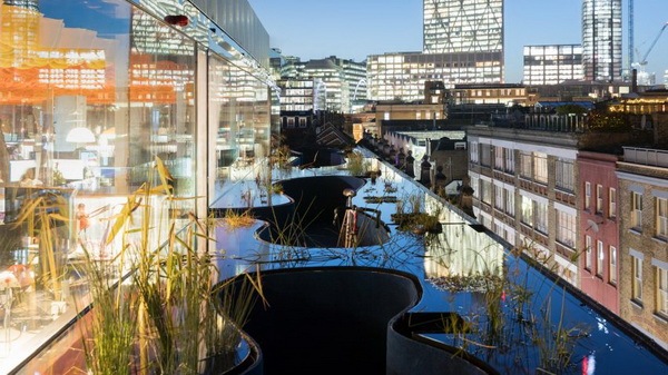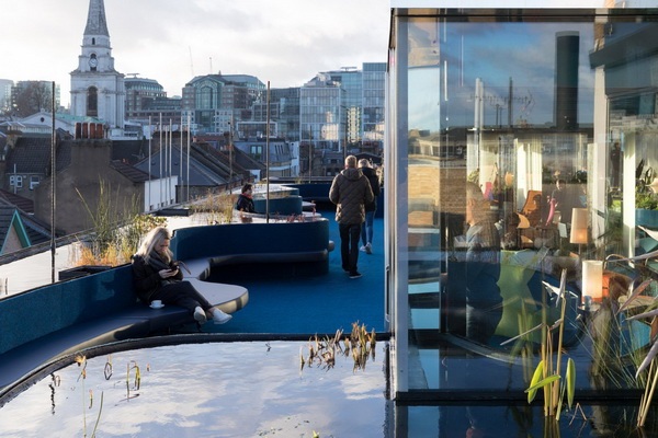 SelgasCano bổ sung thêm phần mở rộng mái nhà với hồ bơi và cây cối cho Home Office thứ hai ở London. “Điều tuyệt vời về thiết kế của SelgasCano là mọi thứ đều có một mục đích – giống như cách làm tăng diện tích bề mặt trần nhà và tạo ra một môi trường làm việc yên tĩnh cho các đội lớn hơn”, Aldenton nói thêm.