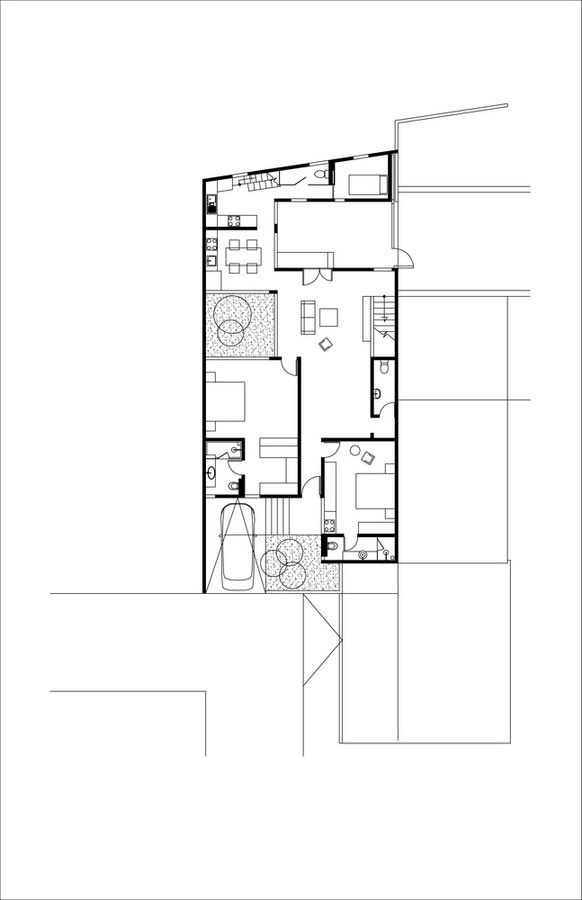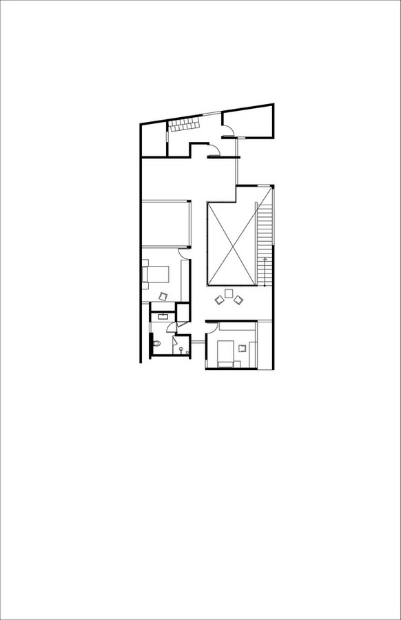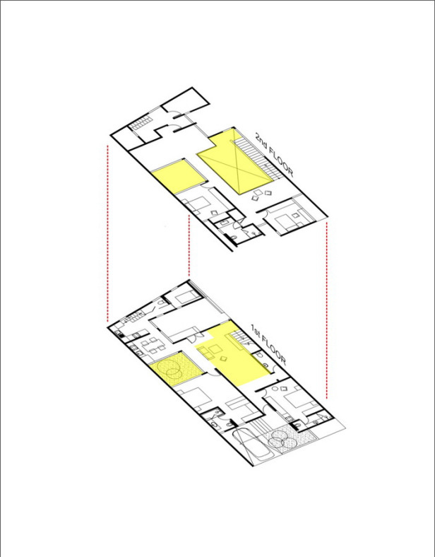 Ngôi nhà gồm hai tầng. Chủ sở hữu thuộc vào tuổi trung niên. Phòng ngủ master và sinh hoạt chung nằm trên tầng lầu, bên cạnh đó là phòng ngủ dành cho trẻ và các phòng phụ trợ được đặt trên cả hai tầng. Mỗi căn phòng đều được tiếp xúc với khoảng trống hoặc sân trong với đây đủ ánh sáng và không khí tự nhiên.