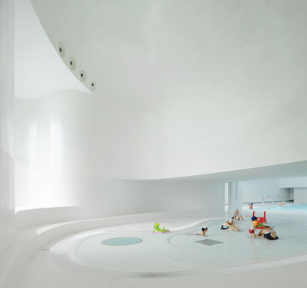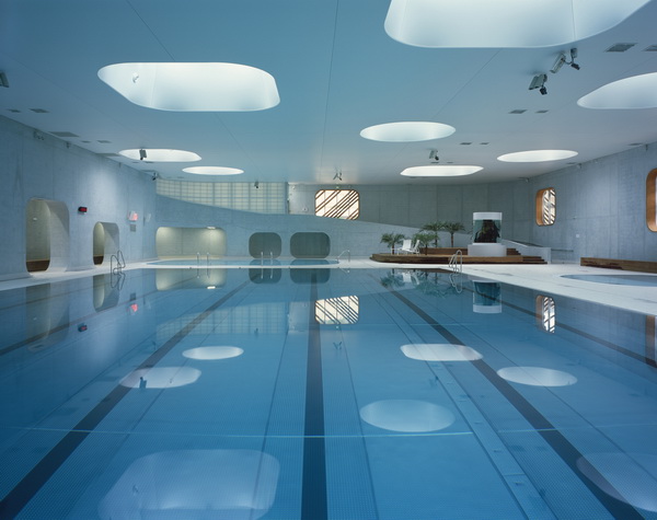 Các kiến trúc sư của khu phức hợp thương mại dưới nước đã tiên phong trong việc thiết kế hồ bơi sáng tạo. Phần hồ bơi mở rộng Dominique Coulon& Associes ở Bagneux được gắn một cửa sổ ngang ở đáy bể bơi nông dành cho trẻ em. Một sân thượng lớn phục vụ như một bãi biển trong trường hợp thiếu hụt những đặc trưng tự nhiên thực tế. Trong khi đó, hồ bơi phong thuỷ của Mikou Studio kết hợp thiết kế hồ bơi truyền thống với giếng trời dạng chấm tròn bằng kính và những thanh gỗ uốn lượn trên tường để tham chiếu về những nguyên tắc của phong thuỷ.