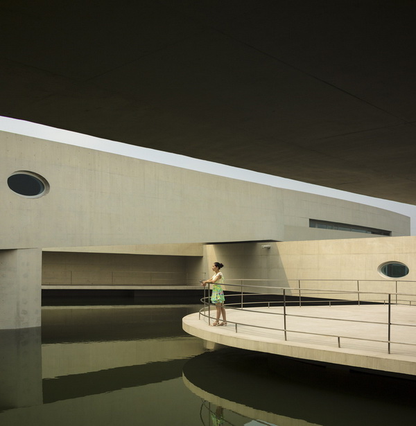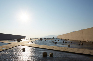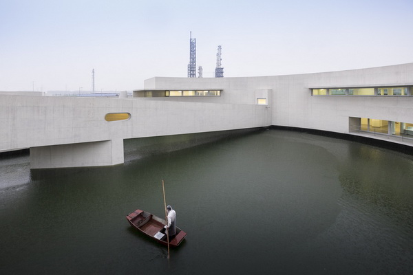 Một số kết cấu, thay vì kết hợp nước ở bên trong, thì lại dựa vào cảnh quan hiện có và xây dựng ở trên đó, ở xung quanh hoặc xuyên qua các yếu tố mặt nước đó. Công trình trên nước của Alvaro Siza và Carlos Castanheira đặt văn phòng của một nhà máy hoá chất khổng lồ trên mặt hồ nhân tạo rộng lớn phục vụ khu phức hợp. Được xây dựng bằng bê tông trắng và kính bao lấy ánh sáng và độ phản chiếu, hình dạng đường cong của kết cấu gợi lại cảm giác về sự lưu loát tự nhiên của công trình và thách thức cái kiến trúc công nghiệp góc cạnh truyền thống.