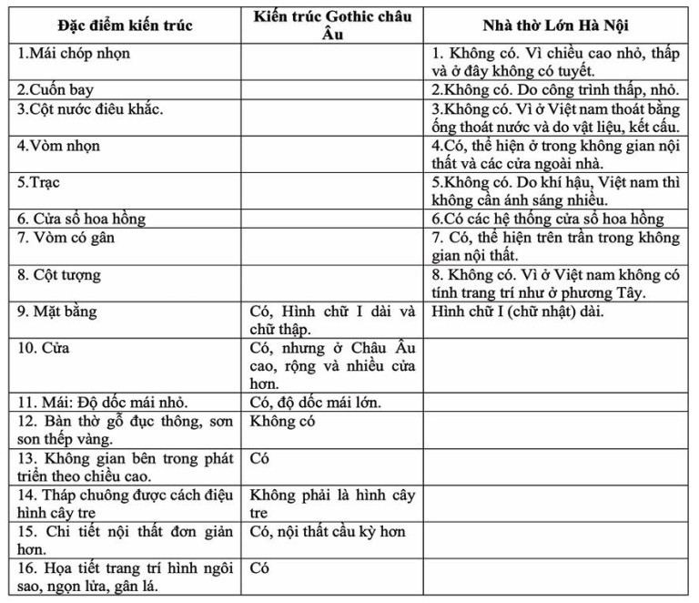 Căn cứ vào 8 đặc điểm của kiến trúc Gothic châu Âu và 8 đặc điểm của nhà thờ Lớn Hà Nội có bảng thống kê sau: