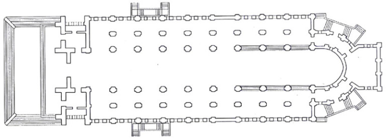 Đặc điểm mặt tiền theo phong cách Gothic như: Hai tháp chuông đối xứng, cửa sổ hoa hồng, vòm nhọn