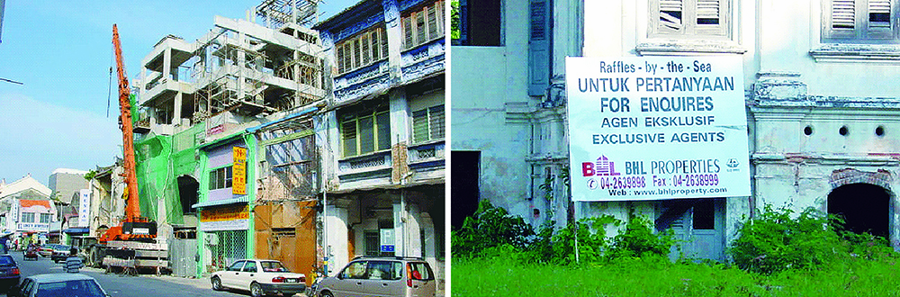 Di sản văn hóa đã hỗ trợ phát triển kinh tế, nhất là du lịch, nhưng việc gia tăng giá trị bất động sản du lịch đã đặt ra những thách thức nghiêm trọng cho diện mạo cũng như công năng sử dụng của chúng. Đặc biệt tại khu trung tâm di sản, bao gồm Jalan Muntri, Phố Light, Phố Beach và Love Lane. Thêm vào đó, cơ cấu dân cư truyền thống cũng thay đổi, 85% người dân George Town chuyển ra ngoài, bởi vì họ không còn đất, khiến nơi này suy tàn với nhiều tòa nhà bị bỏ hoang và đổ nát. Các công ty Châu Âu và Singapore sở hữu 83 trong số 120 công trình di sản ở nội thành George Town. Việc này đã khiến Chính phủ phải ban hành Đạo luật Kiểm soát Cho thuê nhà năm 2000.