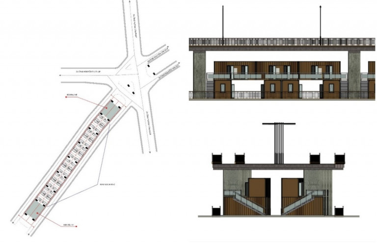 Do đặc điểm không gian bên dưới chân cầu vượt khá dài và cao, gồm nhiều nhịp lớn nên hoàn toàn có thể bố trí một khu ở tại mỗi nhịp cầu. Trong mỗi khu ở, sẽ bố trí hành lang đi lại, có khoảng sân chung để sinh hoạt và các lối giao thông đứng (nếu khu ở có nhiều tầng). Do ảnh hưởng của giao thông hai bên chân cầu nên lối giao thông vào trong mỗi khu ở chỉ có thể tiếp cận ở giữa nhằm đảm bảo an toàn cho người sử dụng. Để đảm bảo việc tiết kiệm không gian và đảm bảo an ninh – an toàn bên trong khu ở thì người sử dụng sẽ để xe tập chung tại bãi giữ xe.